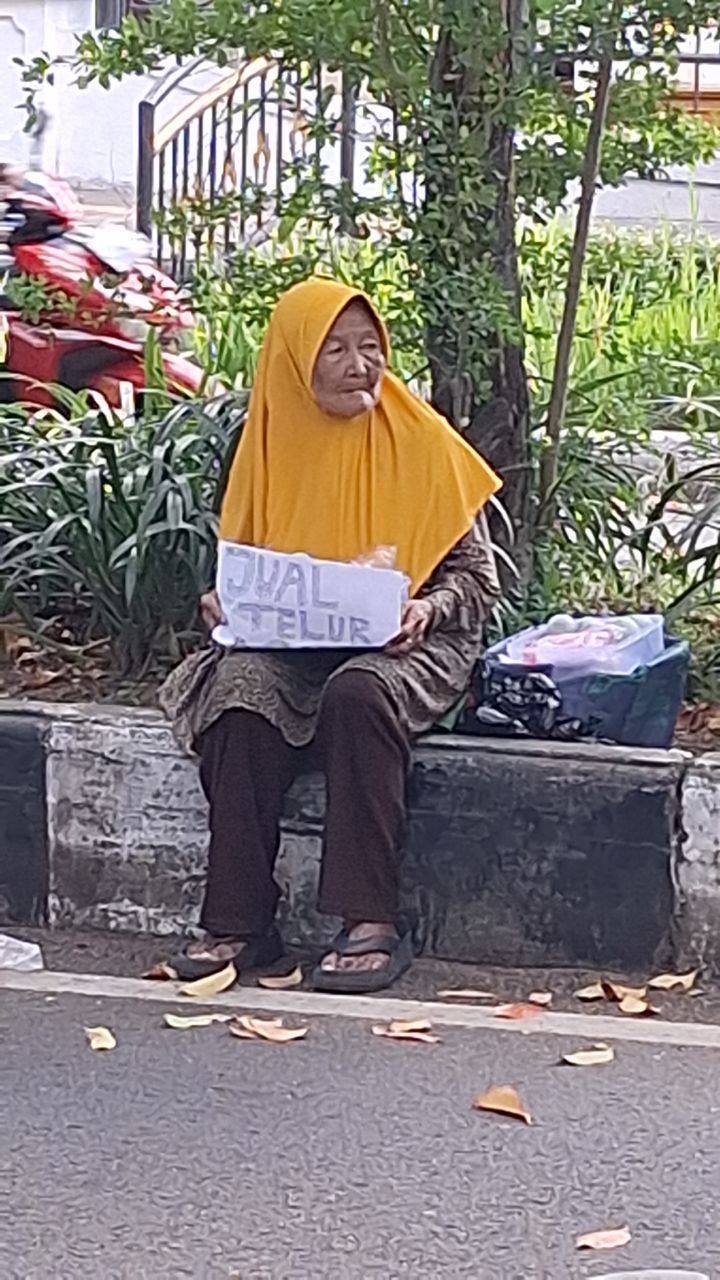 Setiap pagi ia menjual telur asin seorang diri di pinggir jalan, duduk di bawah panas matahari menunggu pembeli datang.
