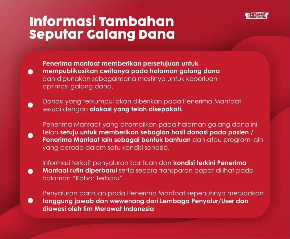 Disclaimer : Merawat Indonesia tidak mewakili dan tidak bertanggung jawab atas segala bentuk informasi pada halaman campaign ini, karena informasi di atas sepenuhnya milik campaigner (penggalang dana).