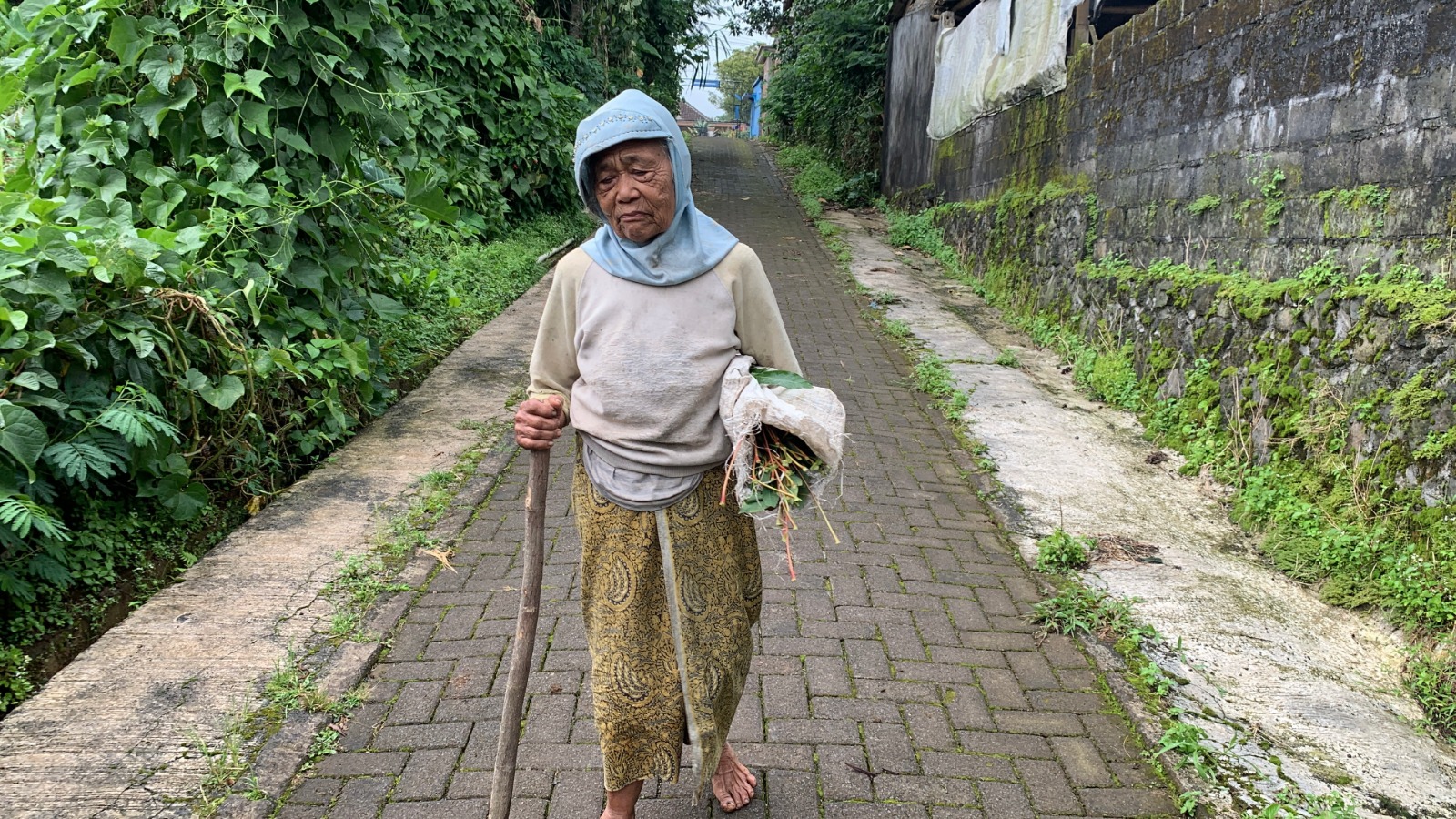 Dengan kondisi tubuh yang sudah renta, Mbah Sini tetap berjalan dari satu desa ke desa lain demi mendapatkan uang untuk makan hari itu.