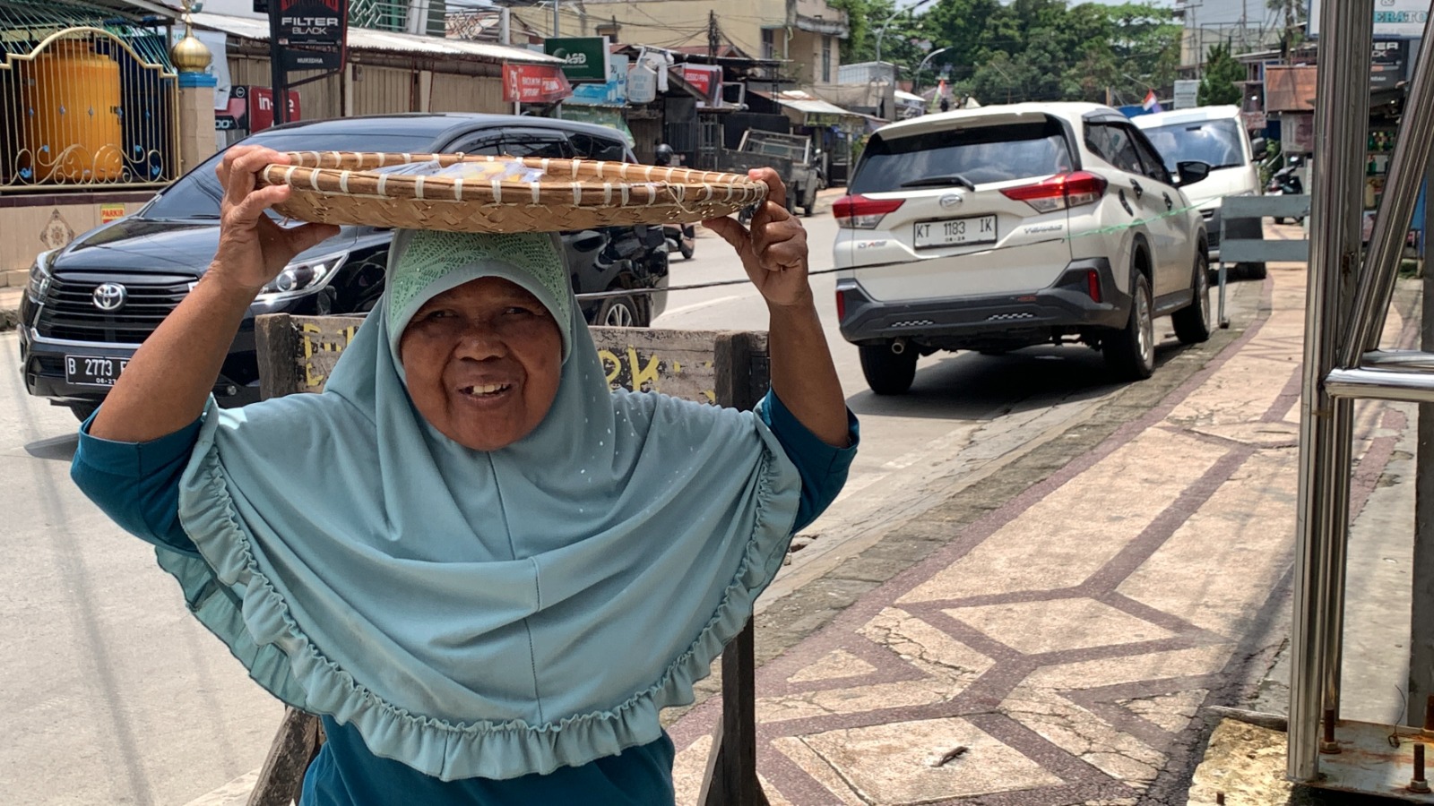 Langkahnya pelan tapi pasti, menempuh perjalanan hingga puluhan kilometer setiap hari.“Kalau laku semua, Alhamdulillah bisa bawa pulang dua puluh ribu… kalau nggak, ya kuenya saya makan sendiri, Nak,” ucapnya lirih sambil tersenyum.