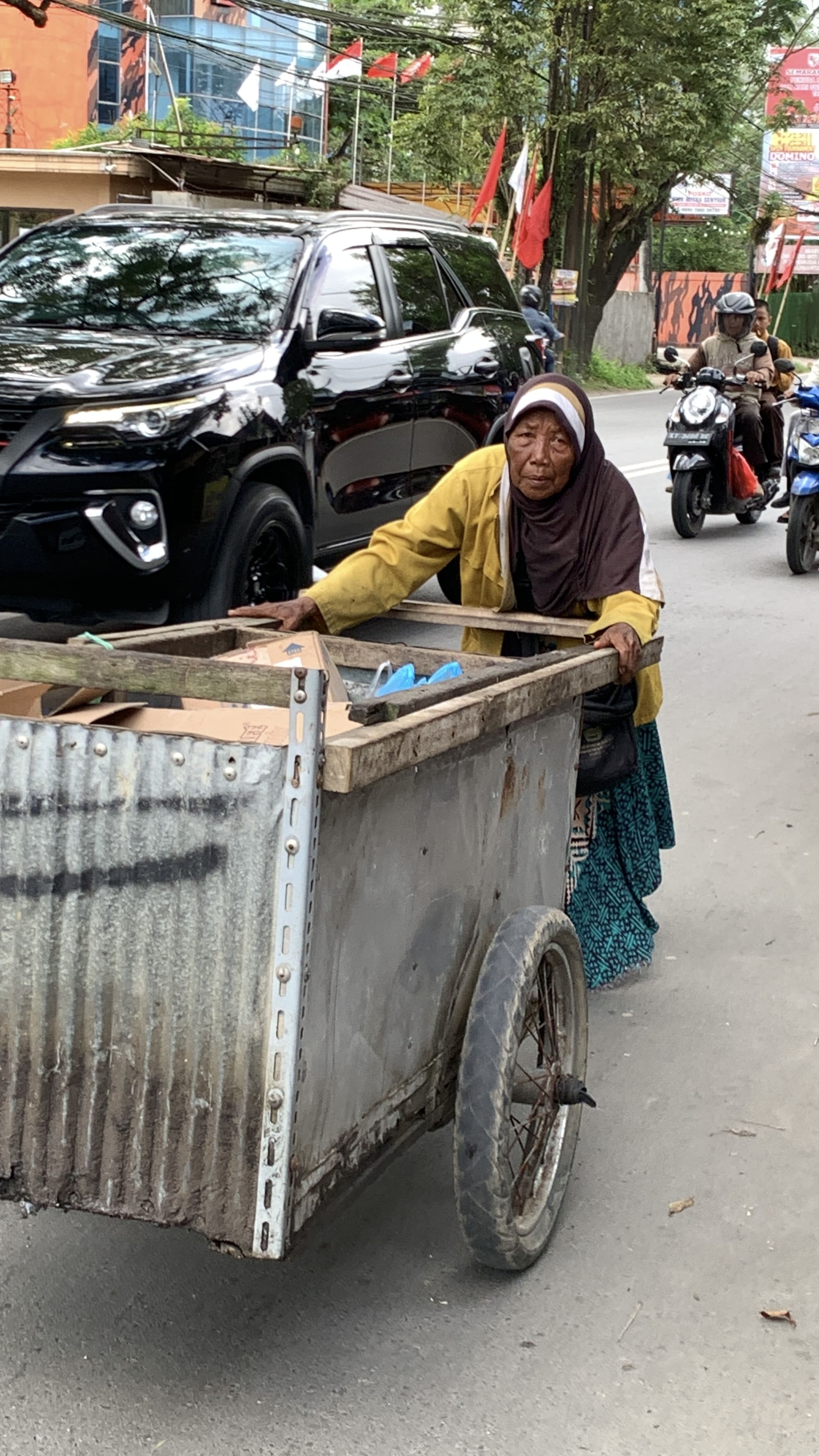 Setiap pagi dari pukul tujuh hingga menjelang siang, Mbah Rustini (65 tahun) mendorong gerobaknya menyusuri jalan dan gang-gang kota untuk mencari barang bekas. Tubuhnya sudah bungkuk, langkahnya pelan, namun ia tetap berusaha mengumpulkan apa pun yang bisa dijual. Sejak suaminya meninggal beberapa tahun lalu, pekerjaan inilah yang menjadi satu-satunya cara untuk bertahan hidup.