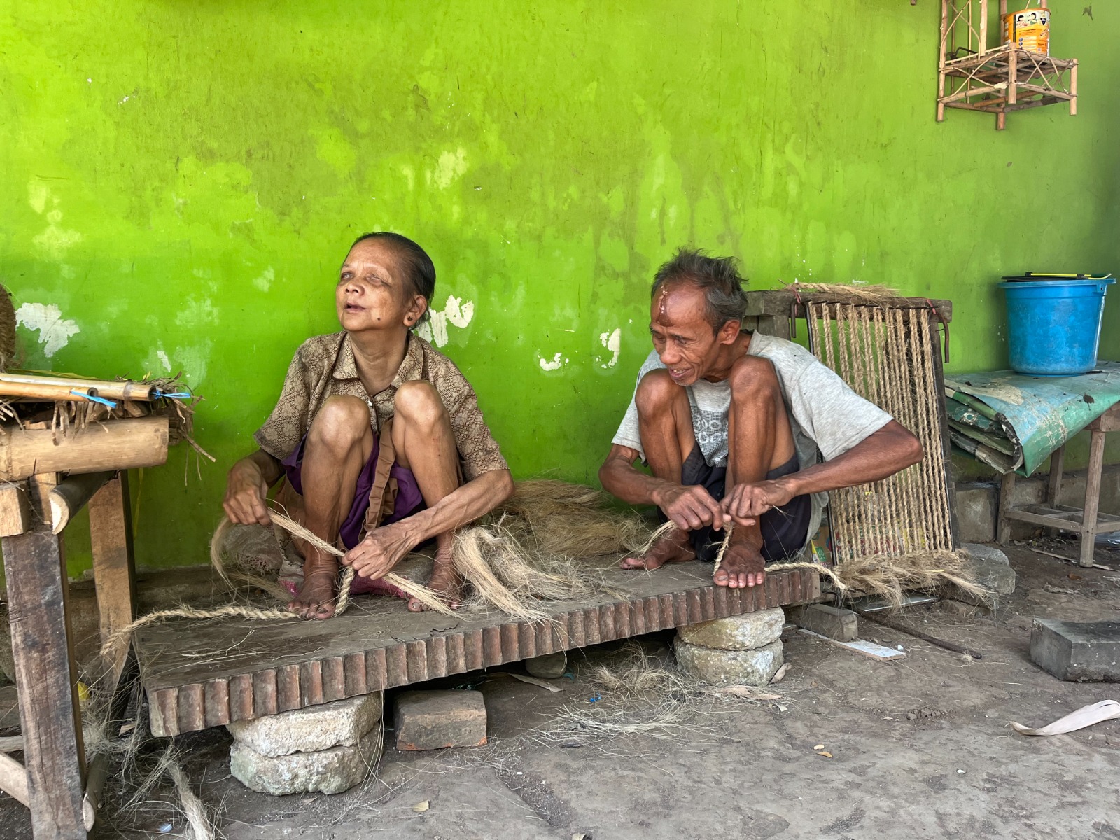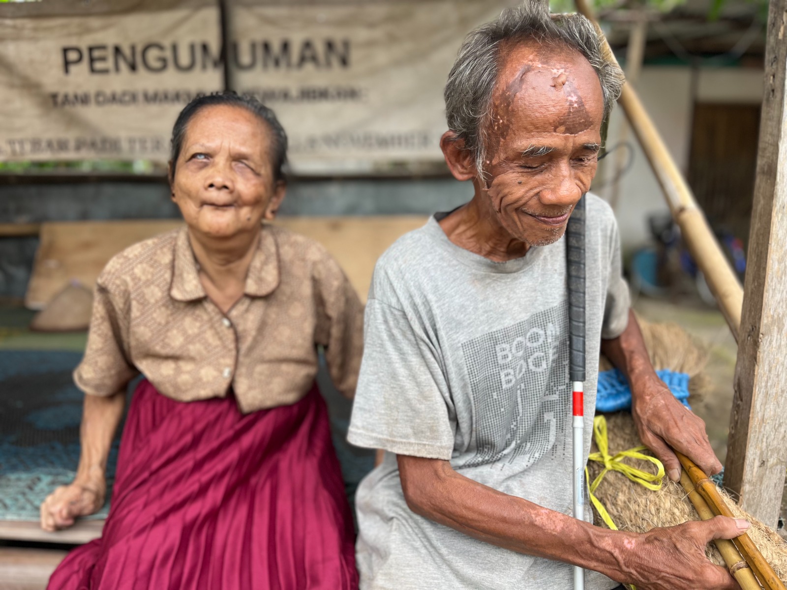 Bersama istrinya, Mbah Riyati (67), yang juga tunanetra, mereka menjalani hari-hari dengan penuh keterbatasan. Di rumah sederhana, keduanya menghabiskan waktu membuat keset dan sapu dari serabut kelapa. Dengan tangan yang mulai gemetar, Mbah Riyati mengurai serabut, sementara Mbah Ponijan menganyam keset hanya dengan mengandalkan rabaan.