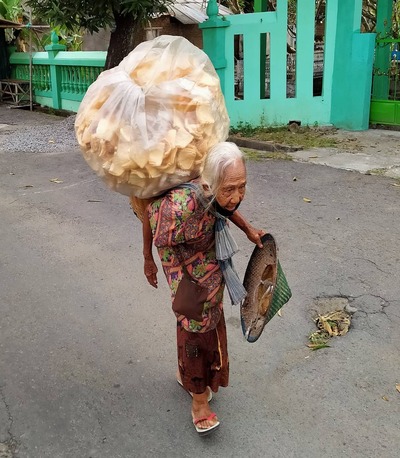 Setiap hari, Mbah Riyem berjalan keliling kampung sambil memanggul 9 kg kerupuk di punggungnya tanpa gerobak, tanpa bantuan siapa pun.