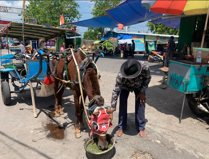 Mbah sering hutang ke tempat pembelian minum untuk kudanya karena tidak sanggup untuk membelinya.