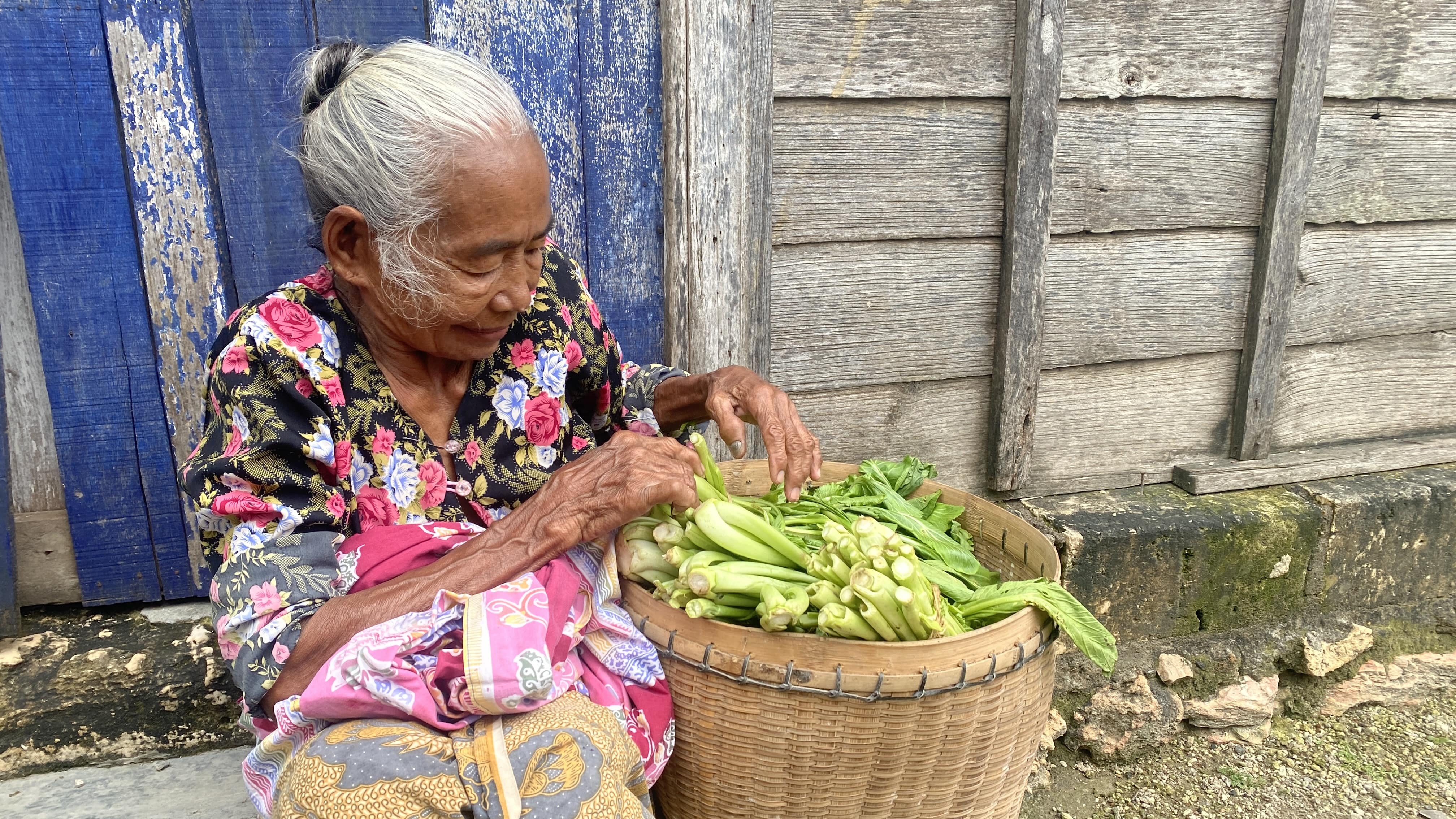Setiap pagi, di bawah terik matahari, ia berjalan keliling kampung dengan langkah tertatih, membawa bakul berisi sayur yang dijajakannya dari rumah ke rumah.