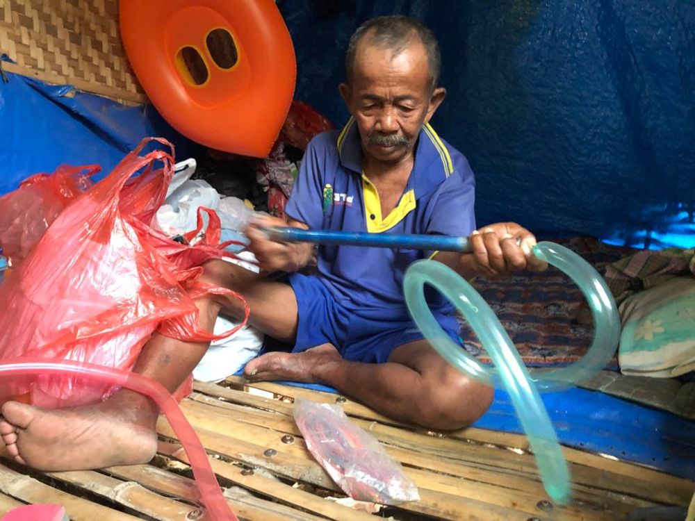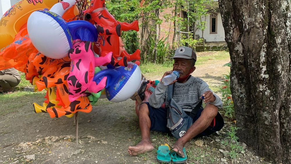 Udah berhari-hari jualan emang lagi sepi nak, sampai ada balon yang keburu kempes saking belum lakunya. Bahkan bisa saja gak laku dijual kalau kempes dan gak bisa dipompa lagi. Dari balon ini mbah berharap bisa beli makan buat istri dan bisa buat bayar kontrakan…” ucap Mbah Tasripin dengan suara lirih.