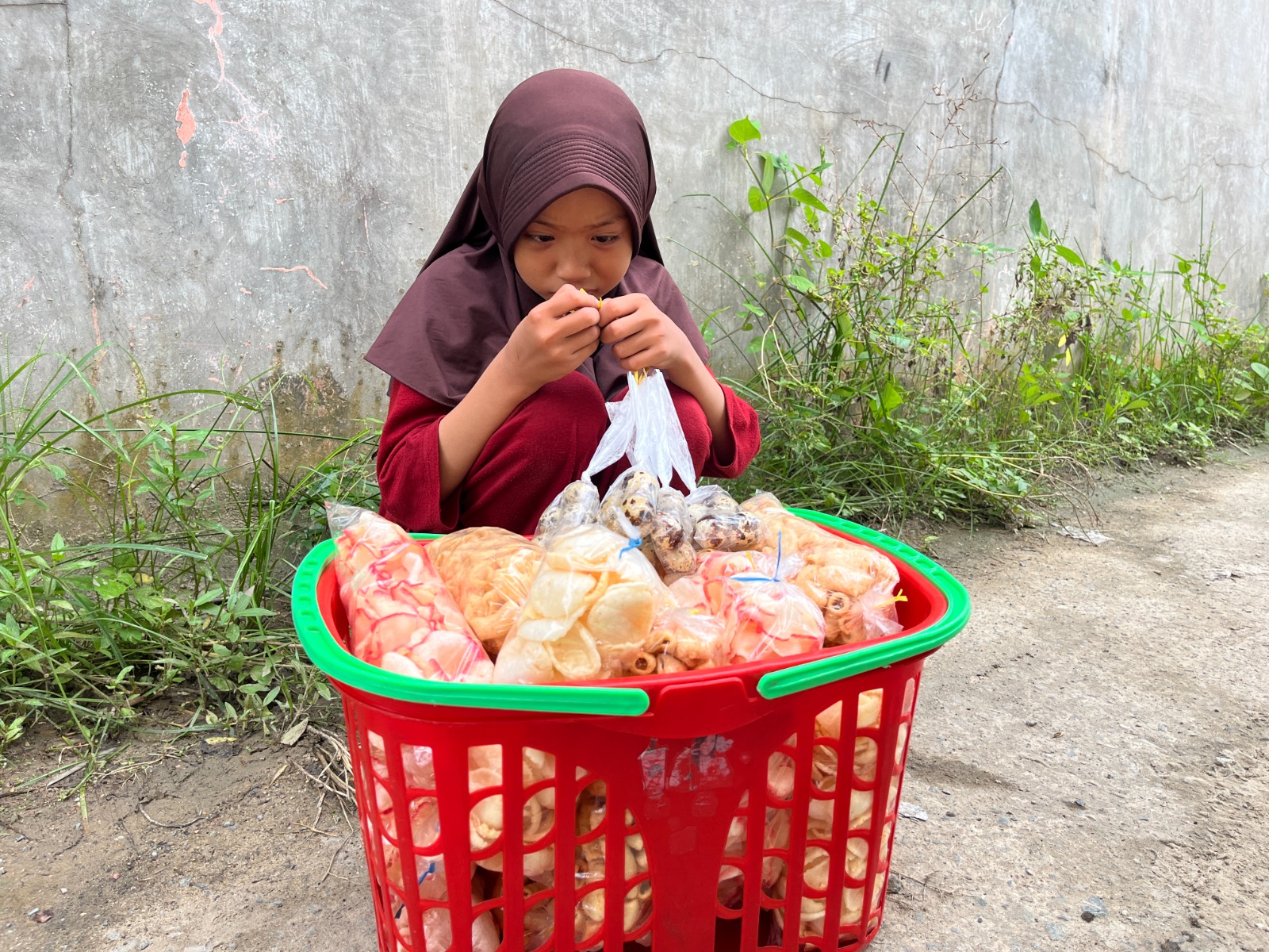 Langkah kecil Aqila (10 tahun) menyusuri jalanan kota sambil membawa keranjang merah berisi kerupuk buatan ibunya.