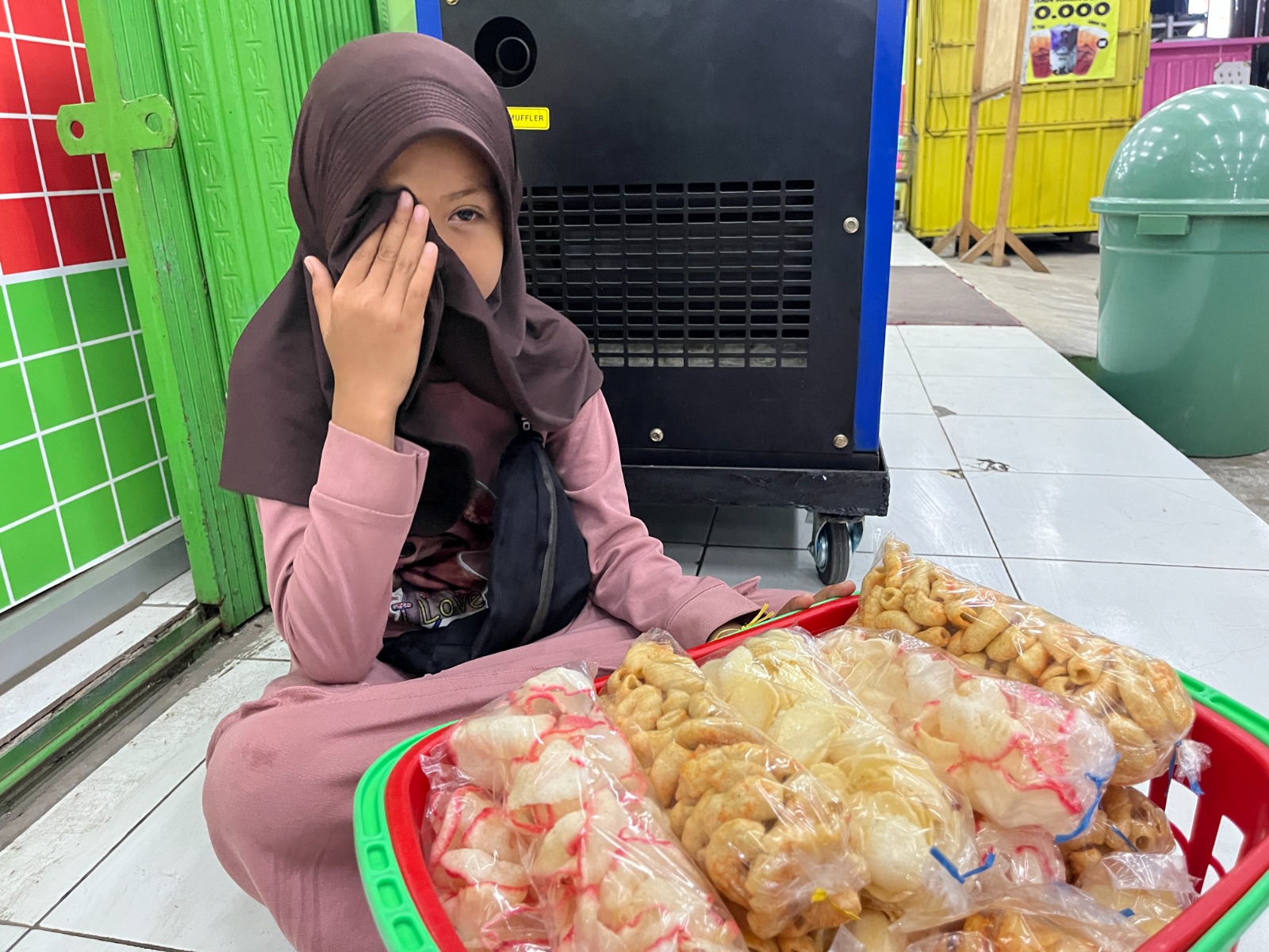 Bukan untuk bermain, tetapi untuk berjualan. Setiap hari selepas sekolah, ia berjalan dari satu sudut ke sudut lain menawarkan dagangannya dengan suara pelan penuh harapan.