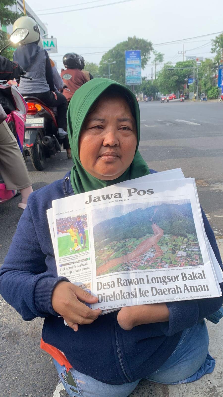 Setiap siang hari, Bu Siti berjualan koran di perempatan lampu merah. Ia berjalan perlahan sambil membawa koran dengan mengandalkan tangannya. Jari-jari tangan kirinya sudah tidak ada, sehingga seluruh tumpuan tubuhnya hanya bergantung pada tangan kanan.