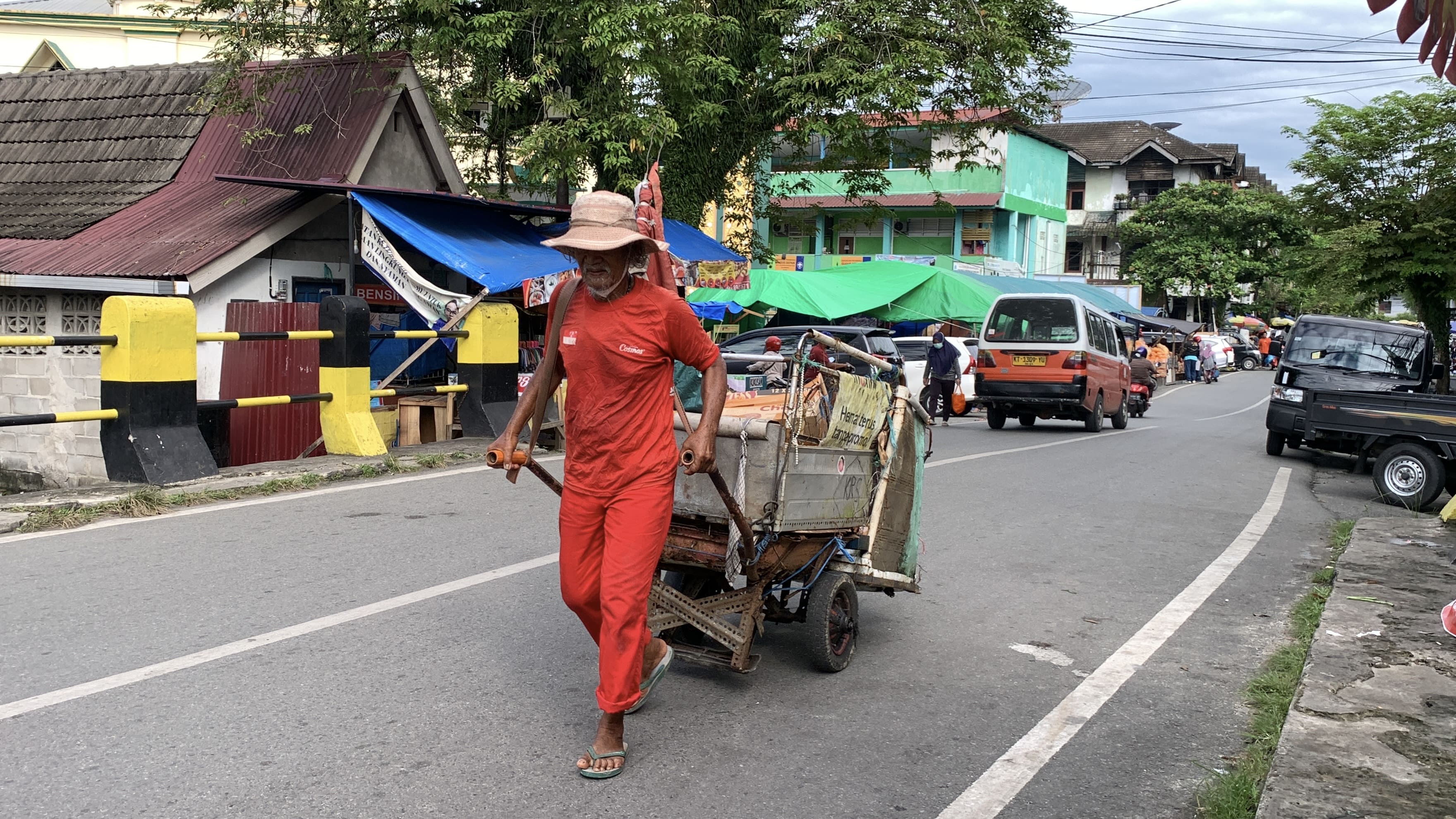 Setiap pagi dari pukul 07.00 hingga siang, Pak Rahman berjalan menyusuri jalanan mencari barang bekas. Dengan tubuh yang sudah renta, ia tetap memungut apa saja yang bisa dijual demi bertahan hidup.