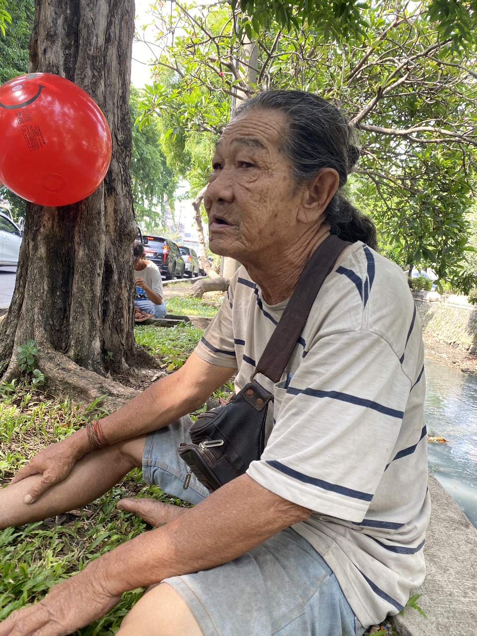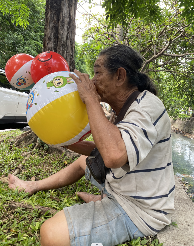 Dari pagi hingga malam, ia menawarkan balon kepada pengendara dan orang yang lewat. Di usianya yang sudah tua, ia tetap bertahan berjualan karena itu satu-satunya cara untuk bisa makan dan membayar kontrakan.