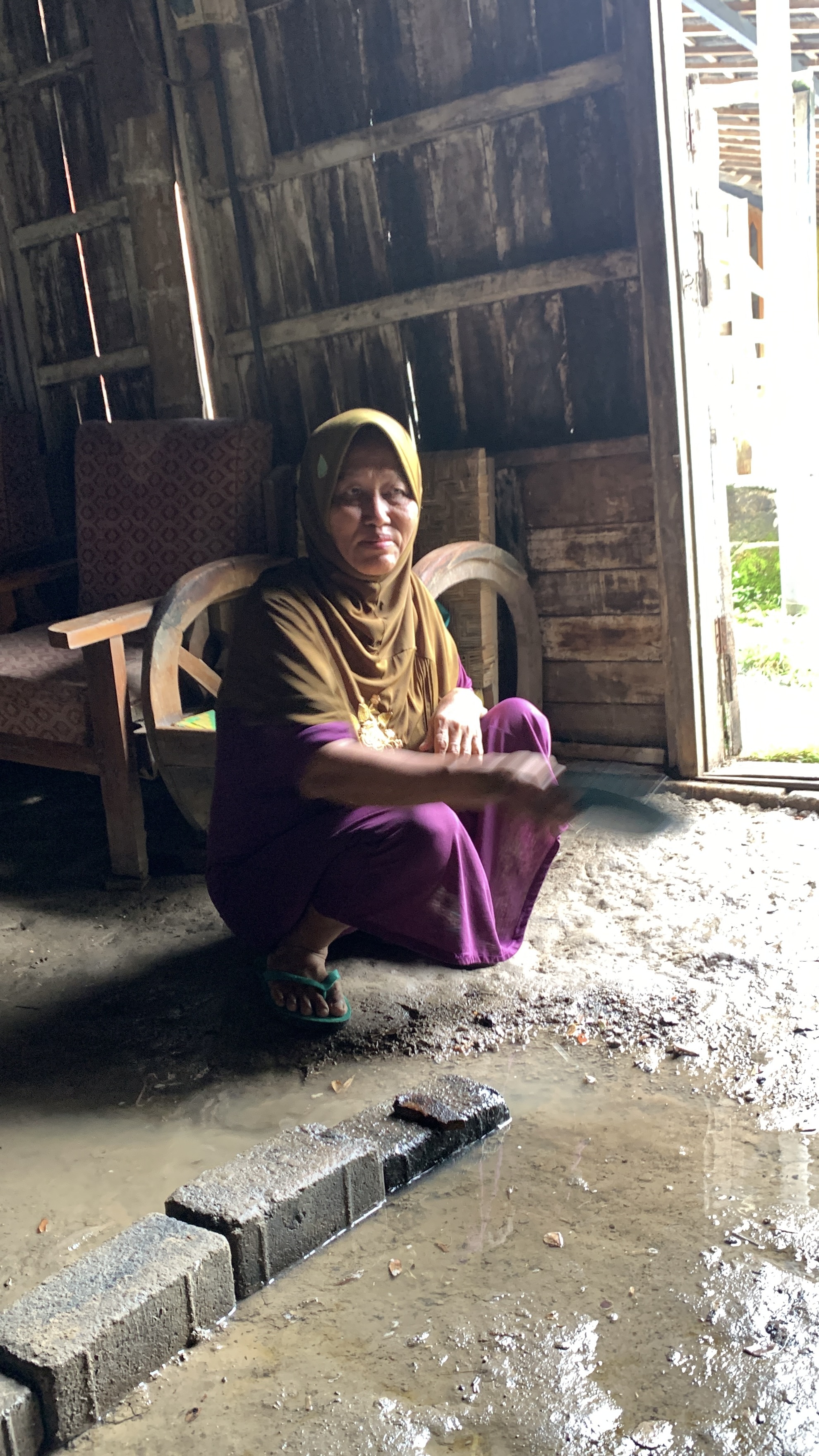 Di tengah genangan air, Mbah Pasirah hanya bisa duduk di lantai basah, tubuhnya menggigil. Dengan sebuah piring atom di tangannya, ia menguras air satu per satu. Sendirian. Tanpa bantuan siapa pun.